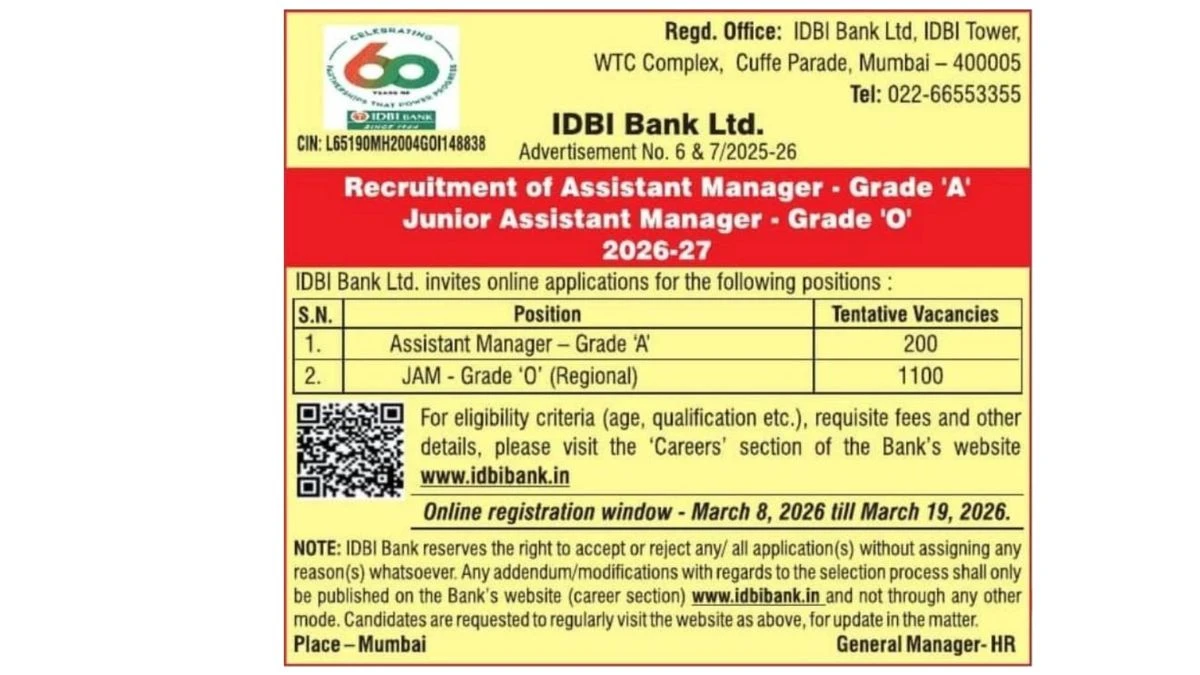 The Industrial Development Bank of India Junior Assistant Manager Recruitment 2026 has been announced through a short notification for candidates looking for a career in the banking sector. This recruitment drive aims to fill 1100 Junior Assistant Manager (JAM) vacancies across various branches of the bank in India. Candidates who have completed a Bachelor’s Degree from a recognized university are eligible to apply online for this opportunity. The IDBI Bank Junior Assistant Manager Recruitment 2026 offers an excellent entry-level management opportunity for young graduates who wish to build their career in banking and financial services. The bank plays an important role in the development of the Indian economy by providing financial services and banking solutions to individuals, businesses, and government organizations. Through this recruitment process, IDBI Bank intends to select capable and motivated candidates who can contribute to the bank’s operational and managerial functions. The selected candidates will work as Junior Assistant Managers, handling various banking responsibilities such as customer service, financial operations, loan processing, branch administration, and banking product promotion. The application process for the IDBI Bank JAM Recruitment 2026 will be conducted entirely online through the official website of the bank. Interested candidates must ensure that they meet all eligibility conditions before submitting their online application form. The application window will open on 8 March 2026 and will remain active until 19 March 2026. To apply for this recruitment, candidates must possess a Bachelor’s Degree in any discipline from a university recognized by government authorities such as UGC or AICTE. Candidates who have only completed a diploma program will not be considered eligible for this recruitment. The recruitment process includes multiple stages to select the most suitable candidates. The selection process generally consists of an Online Test, Document Verification, Personal Interview, and a Pre-Recruitment Medical Test. Candidates who perform well in the online examination will be shortlisted for further stages of the selection procedure. Age criteria have also been defined for applicants. Candidates must be between 20 and 25 years of age as per the recruitment rules. However, relaxation in the upper age limit may be applicable for reserved category candidates according to government guidelines. The IDBI Bank Junior Assistant Manager Vacancy 2026 provides an attractive opportunity for graduates who wish to secure a job in the banking sector. Apart from salary, employees may also receive various benefits such as allowances, career growth opportunities, and professional development. Candidates interested in the Junior Assistant Manager Recruitment 2026 should regularly check the official website of IDBI Bank for updates related to the detailed notification, syllabus, examination pattern, and admit card release. Applicants are advised to fill out their application forms carefully and submit them before the deadline to avoid last-minute issues. Overall, this recruitment drive is a promising opportunity for job seekers looking to establish a career in banking. Eligible candidates should prepare well for the online examination and complete their application process within the given dates.
