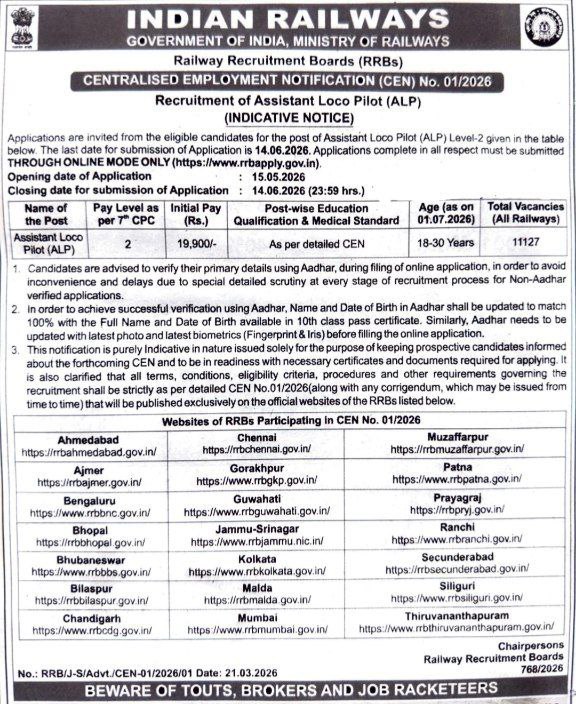 The Assistant Loco Pilot Recruitment 2026 announced by Indian Railways is one of the biggest government job opportunities for candidates interested in working in the railway sector. The recruitment will be conducted through the Railway Recruitment Boards (RRBs) across various regions of the country. A total of 11,127 vacancies are expected to be filled through this recruitment drive. The position of Assistant Loco Pilot (ALP) plays a crucial role in the operation of trains across the railway network. ALPs assist the main locomotive pilot in operating trains safely and efficiently. Their responsibilities include monitoring locomotive performance, checking equipment, and ensuring safe train movement as per railway operating procedures. Candidates who are planning to apply for ALP Recruitment 2026 must submit their applications through the official online application portal. The online application process will begin on 15 May 2026 and the last date to apply is 14 June 2026. Applicants are advised to complete the registration process before the deadline to avoid any last-minute technical issues. The recruitment process will be conducted through multiple stages including Computer Based Tests (CBT) and other evaluation stages as per the recruitment rules. Candidates who successfully clear all the stages will be shortlisted for final appointment. This recruitment drive provides an excellent opportunity for candidates seeking a stable government career with good salary, job security, and long-term benefits. Working with Indian Railways not only offers financial stability but also provides opportunities for career progression within the organization. Applicants must ensure that their personal details and identity information are accurate while filling out the online application. Candidates are also advised to keep their educational documents, identity proof, and other required certificates ready before applying online. The detailed notification will provide complete information about eligibility criteria, educational qualifications, reservation rules, exam pattern, and syllabus. Interested candidates should carefully read the official notification before submitting their application form. Because Indian Railways is one of the largest government employers in the country, the competition for ALP positions is expected to be high. Candidates who prepare well and follow the recruitment guidelines carefully will have a good chance of securing a position. Overall, the Assistant Loco Pilot Recruitment 2026 is a great opportunity for job seekers looking for a central government job in the railway sector with long-term career stability and attractive benefits.
